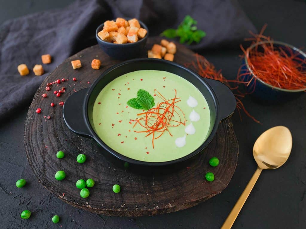 Unsere pürierte Erbsensuppe birgt nicht nur wertvolle Inhaltsstoffe und bringt nicht nur Farbe in kalte, graue Tage, sie ist darüber hinaus auch in jeder Hinsicht alltagstauglich. Schnell gemacht, ohne lange Vorbereitung, ist sie im Nullkommanichts fertig und bietet für Kreative jede Menge Möglichkeiten sie mit Kräutern und Gewürzen nach individuellem Geschmack zu verfeinern. Wer sie frisch mag, würzt sie mit Minze und Zitrone, wer es lieber schärfer hat, kann ihr mit Chilifäden ein bisschen einheizen.